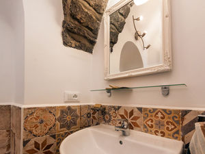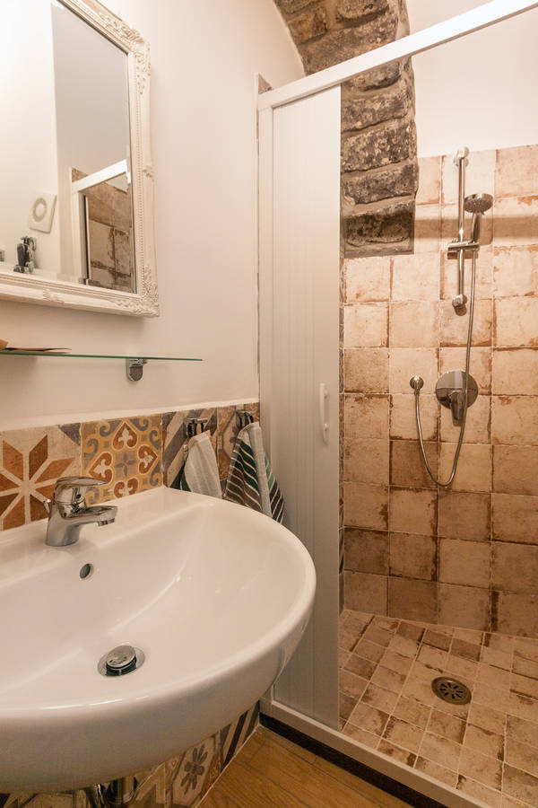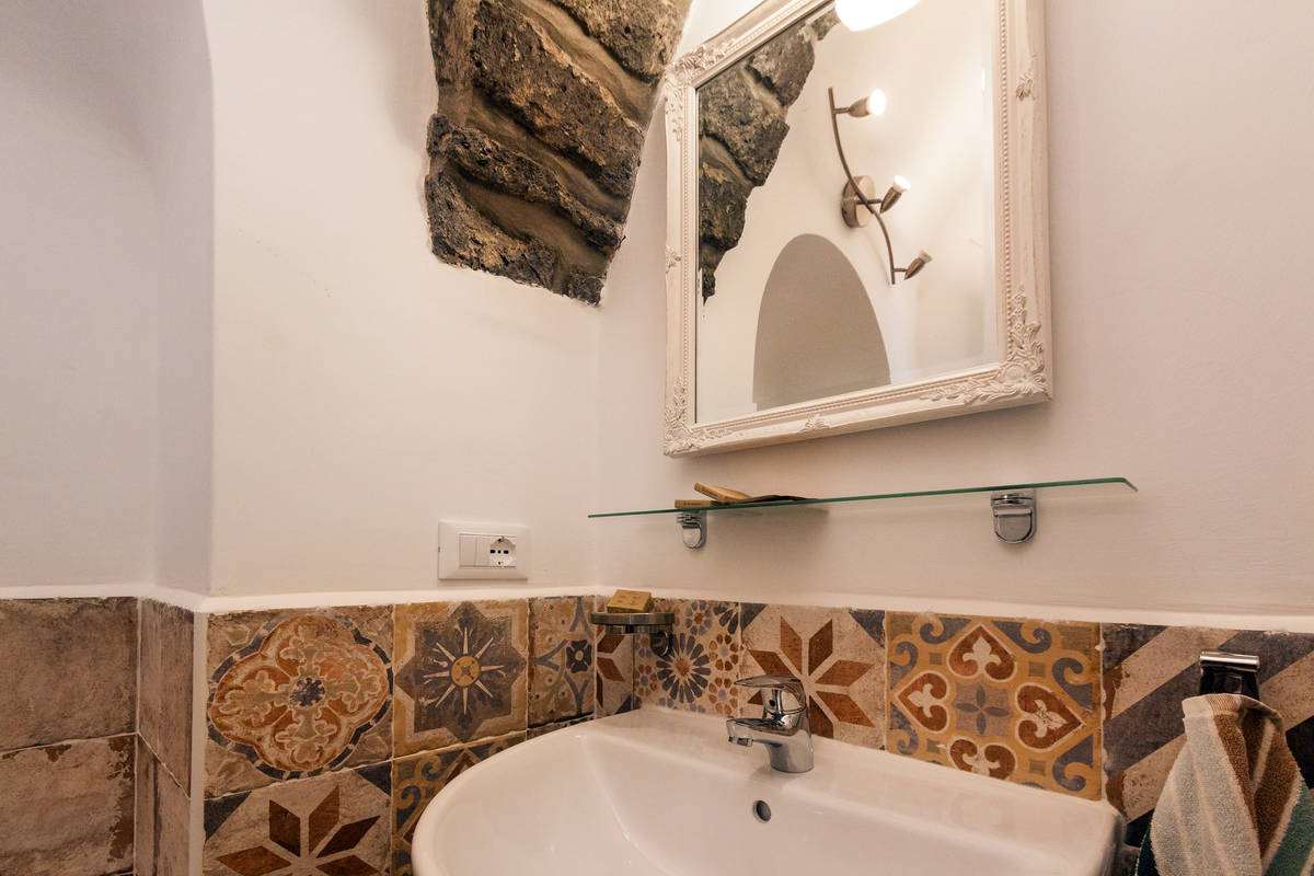 The tiled bathroom is adorned with an ancient arch which is the support to the local Church. It has stand-up shower with detachable showerhead, sink, mirror and toilet.