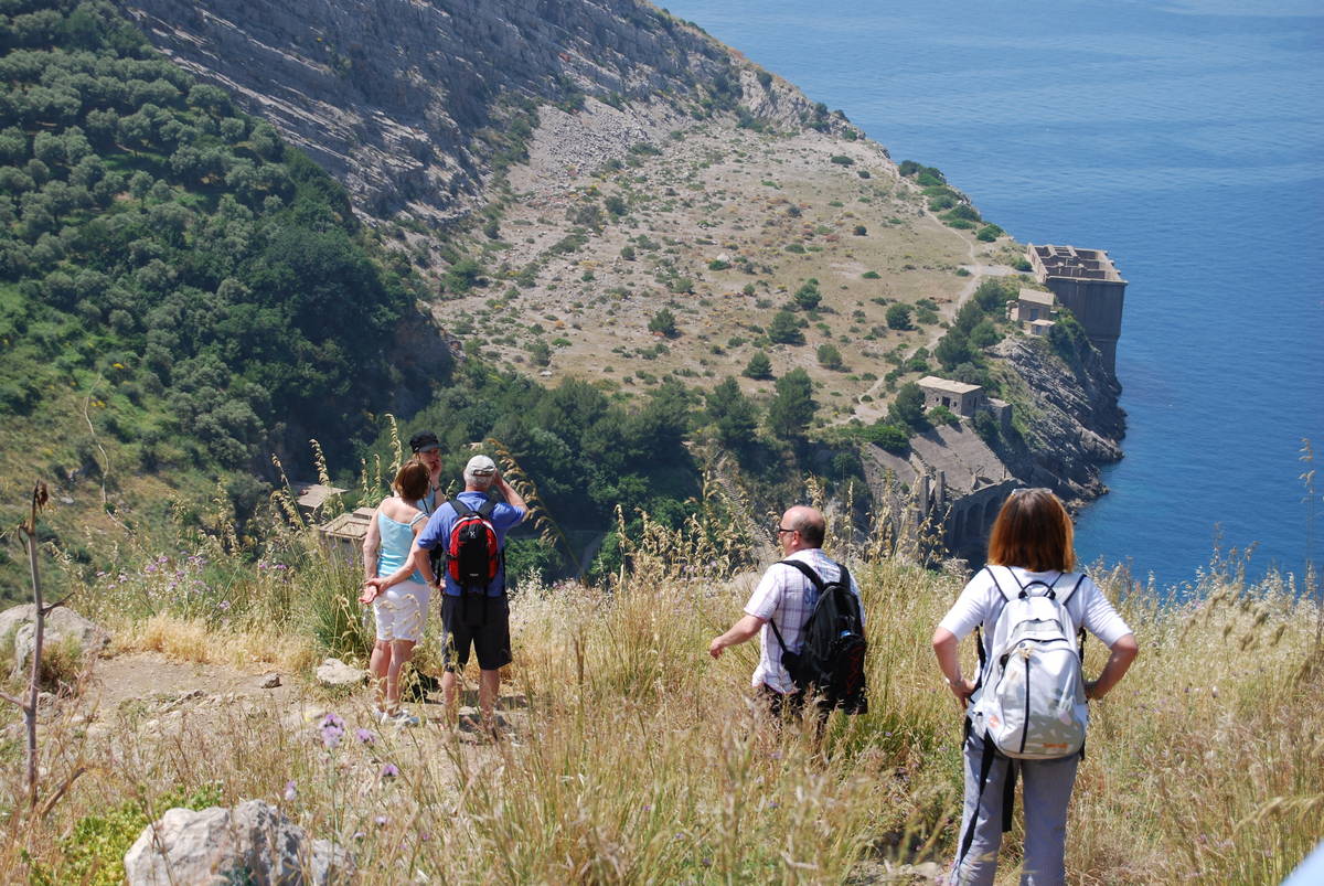 The rocky walls fall sheer to the sea but there is also the possibility to walk on pedestrian routes and on a stair of two thousand years which connected the rocky coastline to the urban area on the top. Along the stairs there is the entrance to the Cave of the Sirens which can be reached also by boat and from other entrances on the wall. In this cave there are plenty of ponds which were used in the past to collect the salt following high tides and the consequent evaporation of the water. Facing the entrance of this cave there is a rock and when the waves push against the rock, a kind of human breath can be heard.